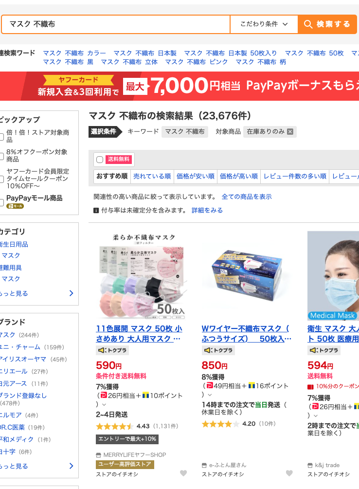 では、「Wワイヤー 不織布マスク(普通サイズ)50枚入」を選んでみます。その商品のページに切り替わりましたよね?次に、そのページのURLをコピーします