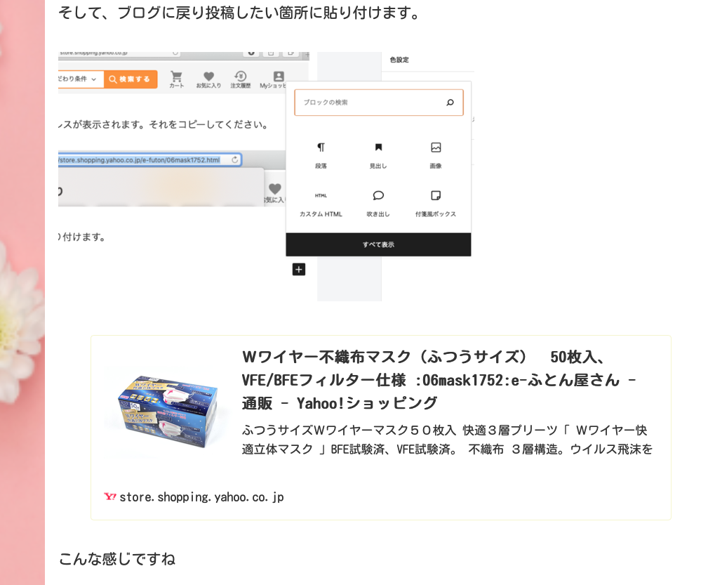 そして、ブログに戻り投稿したい箇所に貼り付けます。
