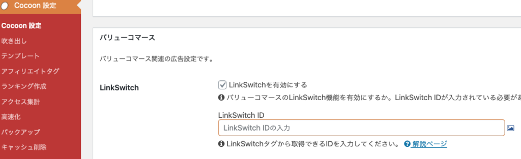 そこで、Linkswitchを有効にするにチェックを入れる。その下のLinkswitch IDの部分には、先ほどメモをしていただいた、数字を記載してください。