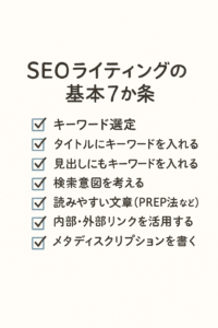 SEO以前に、「読みやすい文章」がとても大切。PREP法(結論→理由→具体例→再結論)など、論理的な流れを意識しましょう。